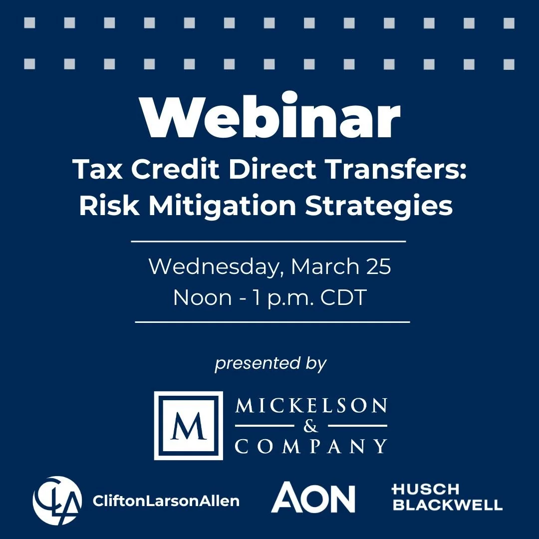 Please join experts from Mickelson & Company, CliftonLarsonAllen, Aon, and Husch Blackwell as they discuss practical risk mitigation strategies for buyers and sellers in the transferable tax credit market, including audit defense measures, legal protections, insurance solutions, and current market expectations shaping today’s transactions.