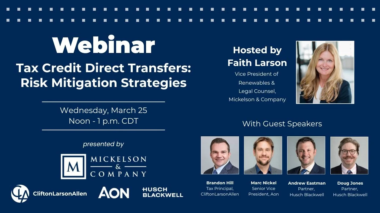 Please join Mickelson & Company as we present a webinar on March 25 from noon - 1 p.m. CDT on Tax Credit Direct Transfers: Risk Mitigation Strategies.